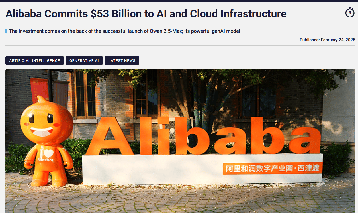 On February 23, 2025, Alibaba pledged $53 billion over three years for AI and cloud infrastructure, exceeding past decade spending, aiming to lead in artificial general intelligence (AGI) and cloud services.Amazon Debuts Alexa+ with Generative AI:
